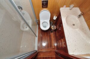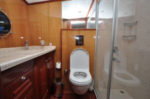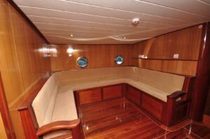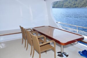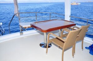 Outside equipment; anchor, outside shower, swimming ladder, dining table, canopy, sprayhood, Transfer Boat.