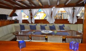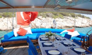 Outside equipment; anchor, outside shower, swimming ladder, dining table, canopy, sprayhood, Transfer Boat.