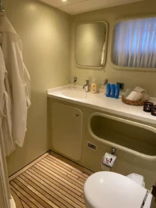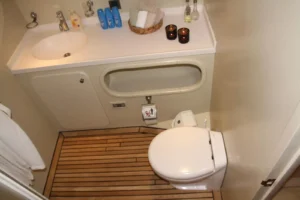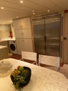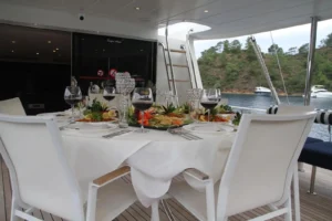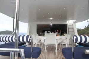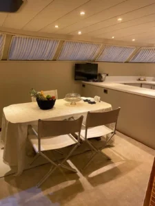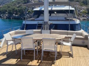 Outside equipment; anchor, outside shower, swimming ladder, dining table, canopy, sprayhood, Transfer Boat.